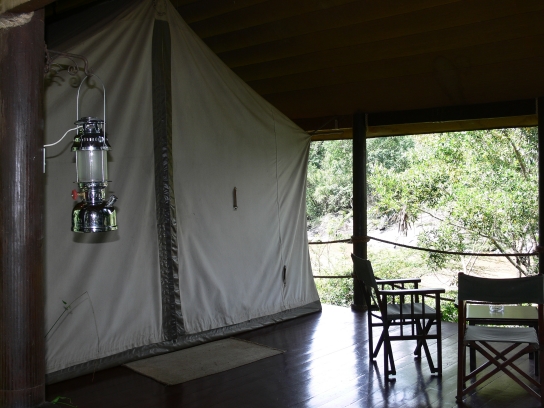 the tents sit on a wooden platform above the river