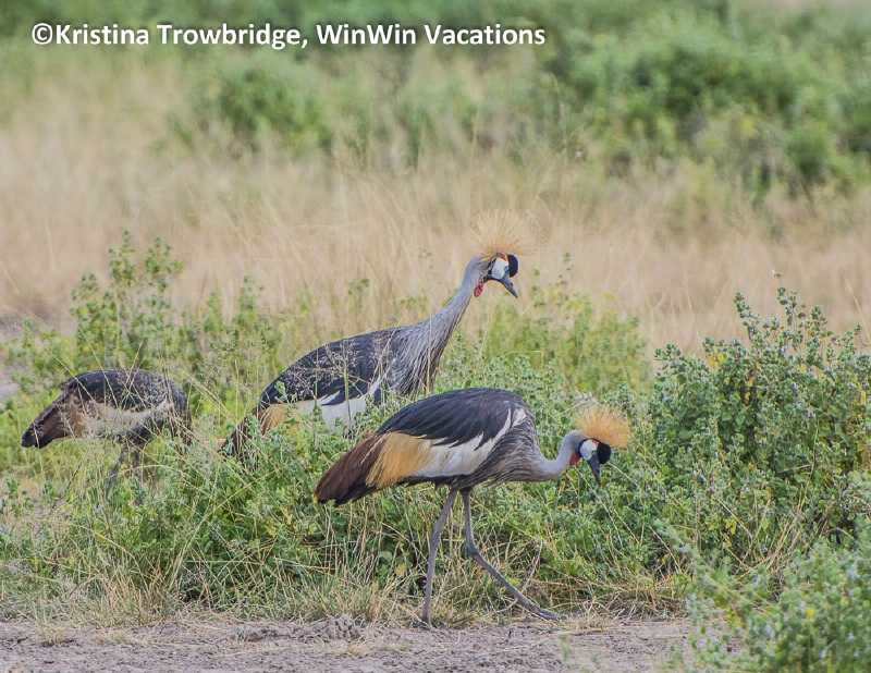 Grey-crowned cranes with a chick