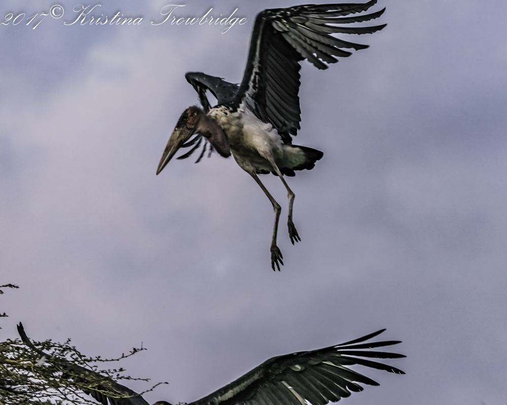 Marabou storks courting at sunset