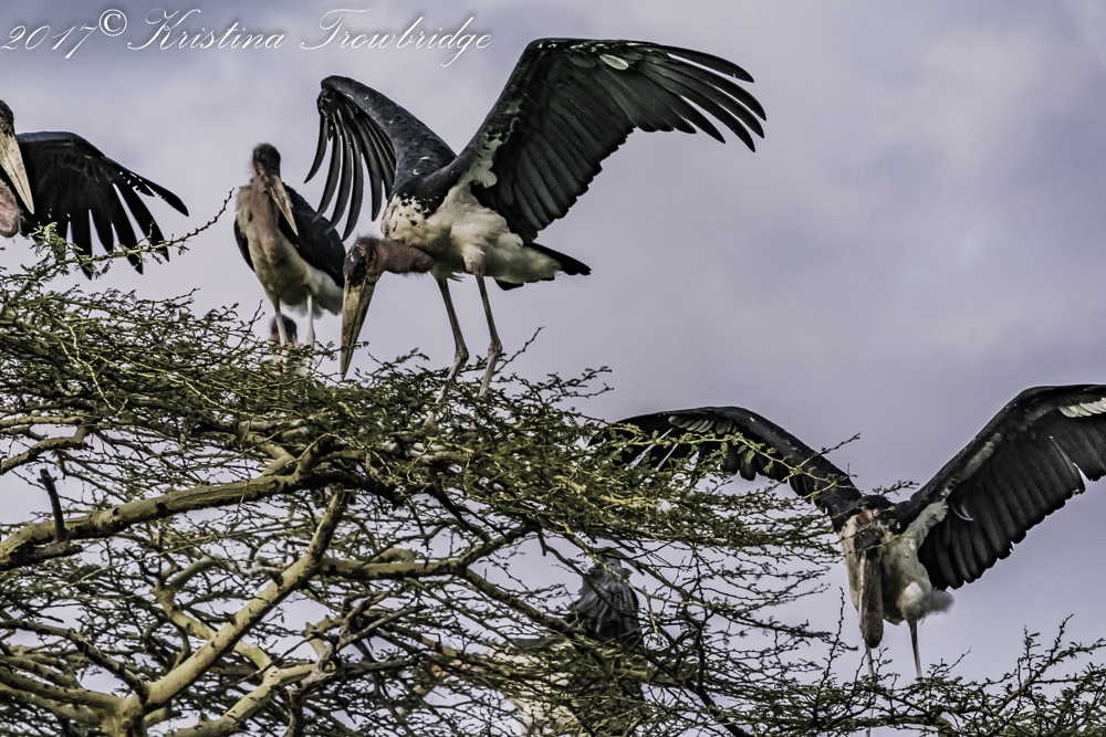 Marabou storks courting at sunset