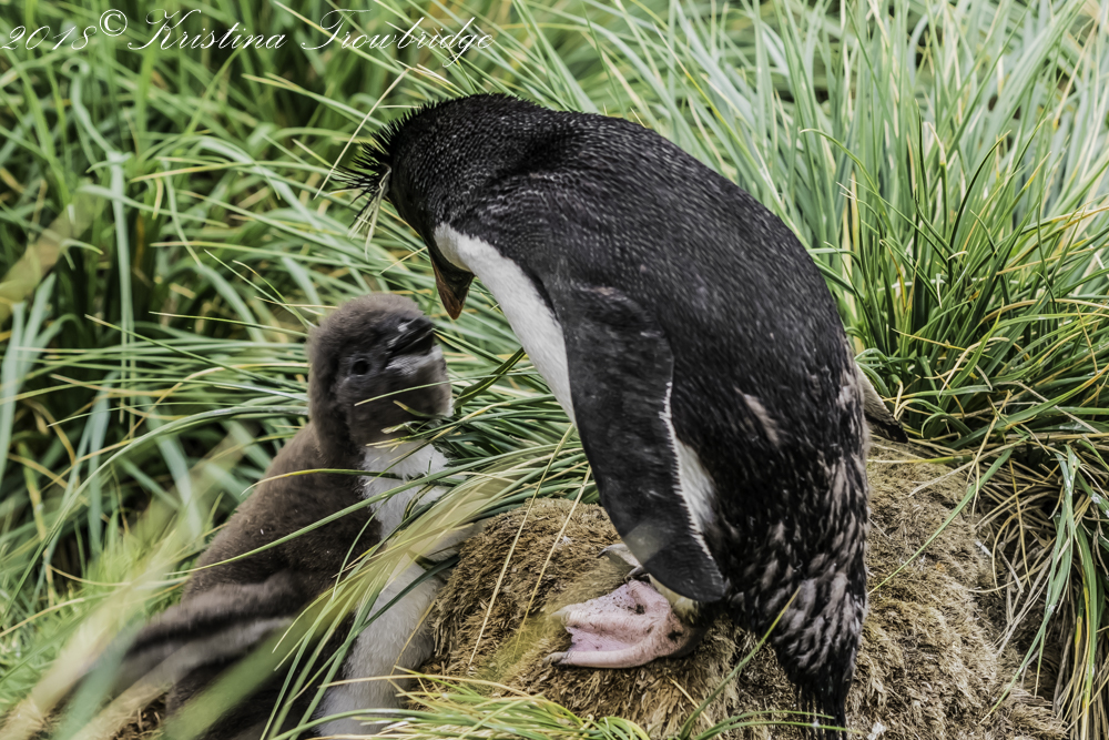 Rockhopper penguin with chick