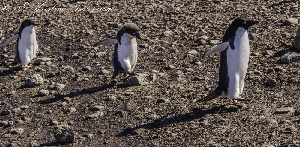 Penguin mom running from 2 chicks