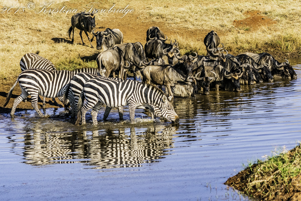 Bearded Wildebeests & Zebras drinking