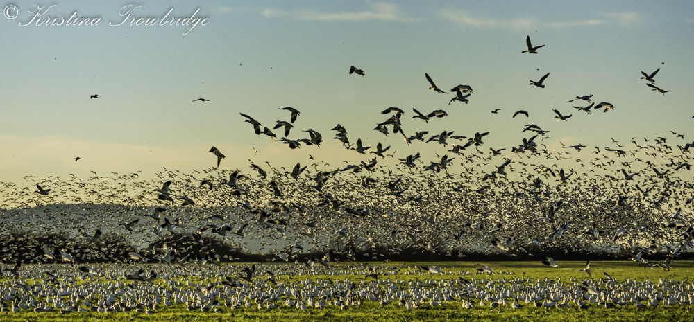 Snow Geese fly chased by a dog