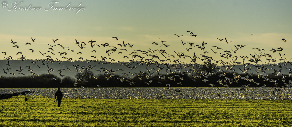 Snow Geese fly into the sunset, hunter & dog