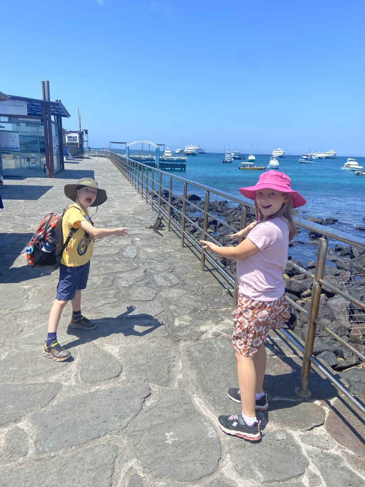 Silas and Mira with Marine Iguana at the Dock