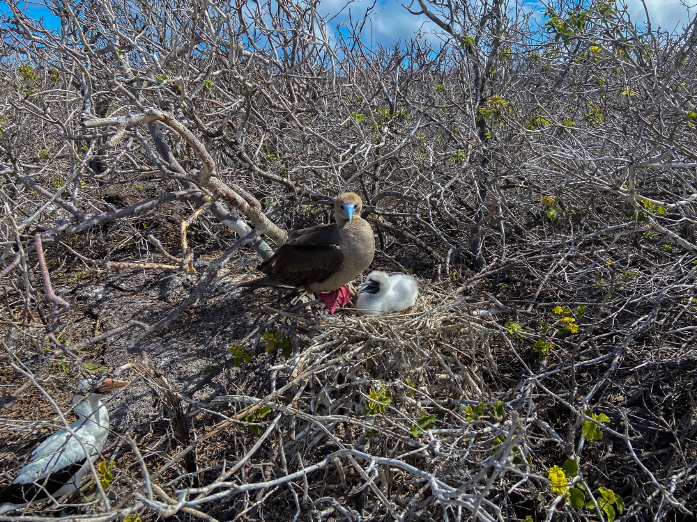 Red-footed Booby with chick and a Nazca Booby