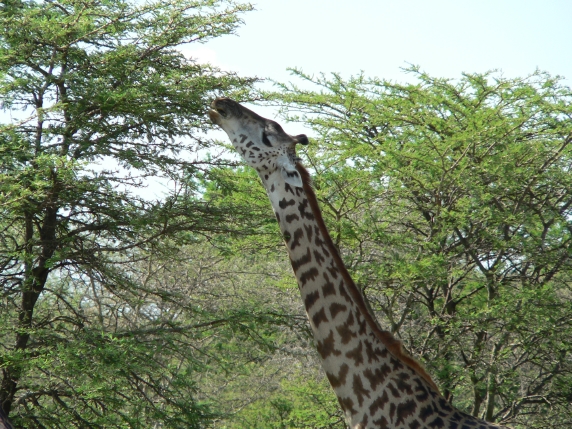 The giraffe is vegetarian, and will feed on spiny or thorny plants