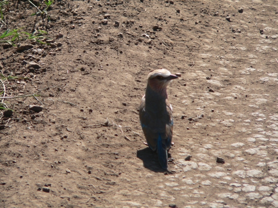 a Lilac-Breasted Roller landed in front of the car