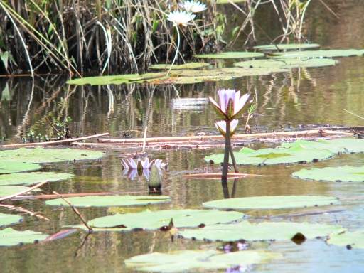 purple, pink, blue and white water lilies also grow here
