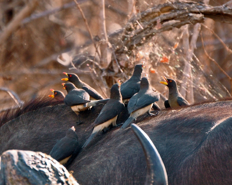 Yellow-billed oxpeckers on buffalo