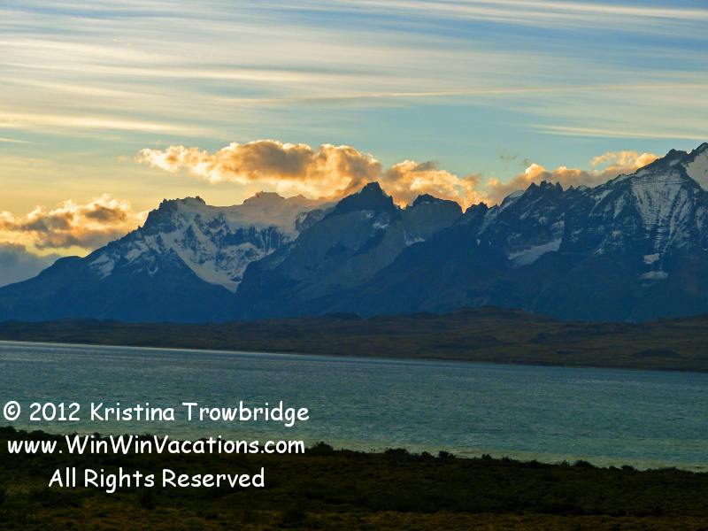 sun is setting across Lago Sarmiento