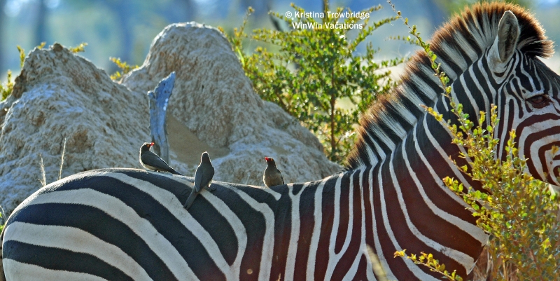 3 red-billed oxpeckers on the back of a zebra