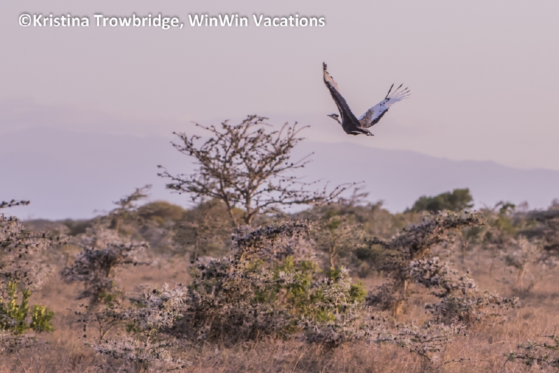 Black-bellied bustard taking off into the sunset