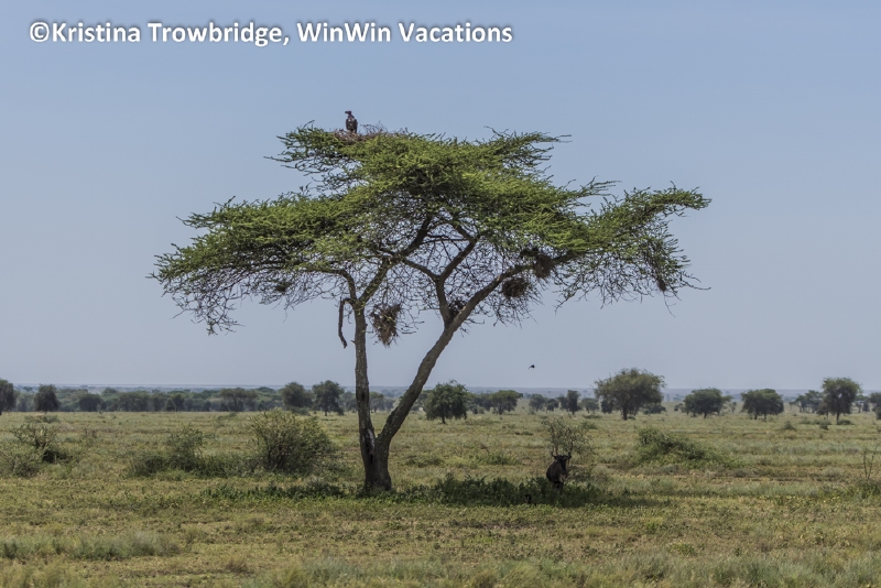 Vulture in Acacia tree, weaver nests and wildebeest