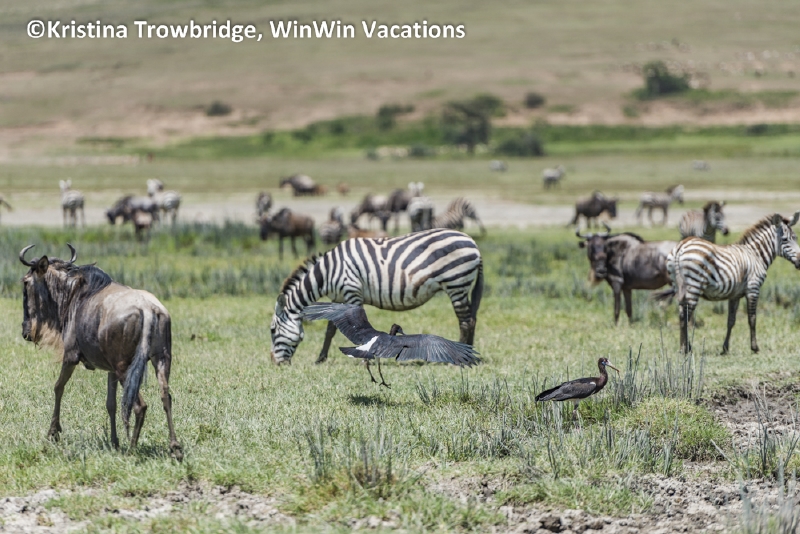 Abdim storks, wildebeests and zebras