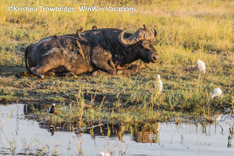 Cape buffalo at sunset with birds