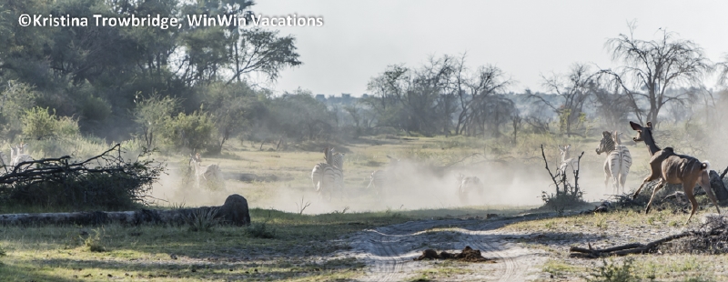 Zebras and kudu in dust