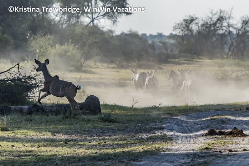 Zebras and kudu in dust