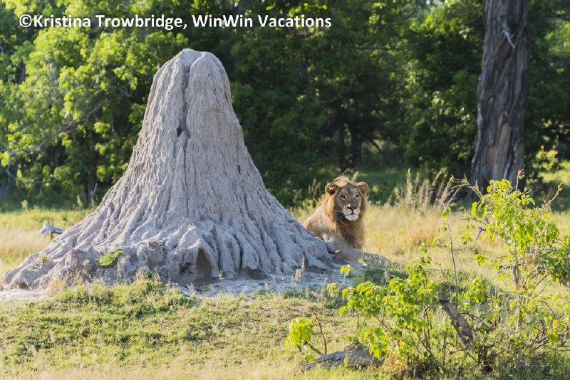 Young lion behind termite mound