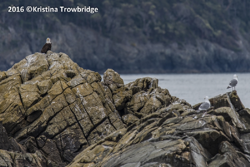 Bald Eagle on a rock with seagulls