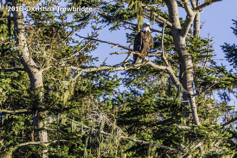 Bald Eagle in tree with hanging curtains of lichens in pine trees