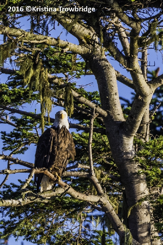 Bald Eagle in tree with hanging curtains of lichens in pine trees