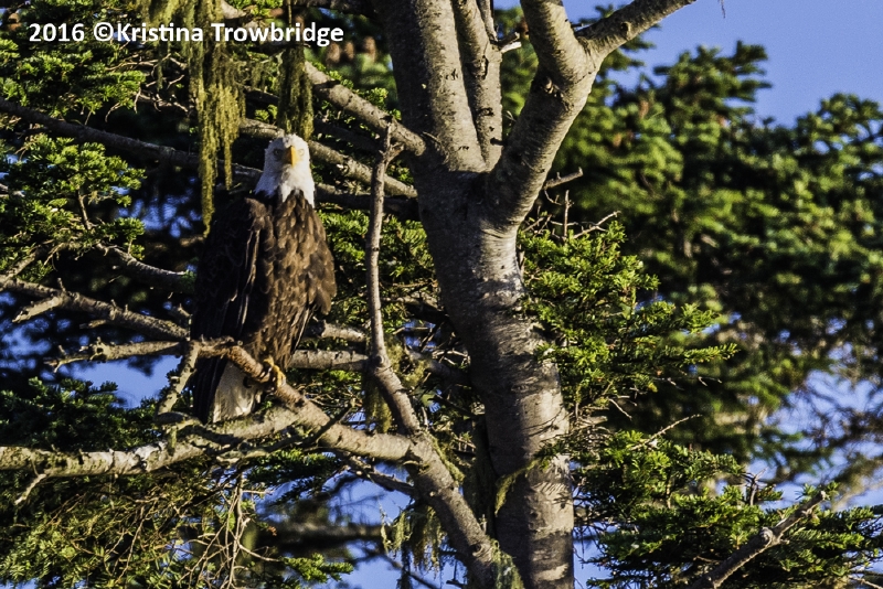 Bald Eagle in tree with hanging curtains of lichens in pine trees