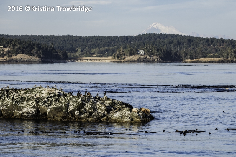 Steller Sea Lions & Cormorants on Whale Rocks with Mt. Baker