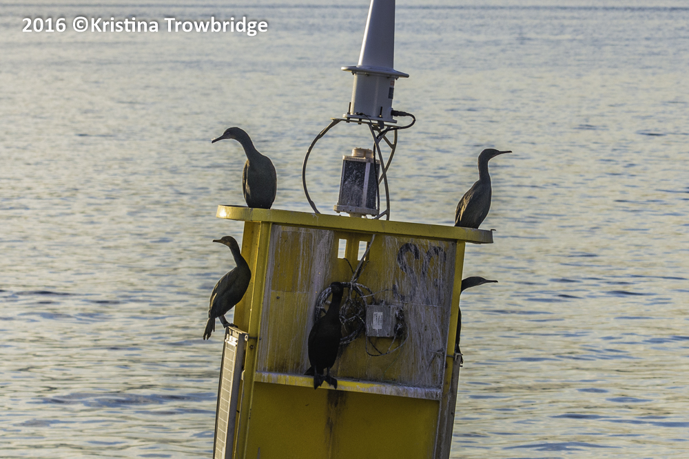 Cormorants on a marker at sunset