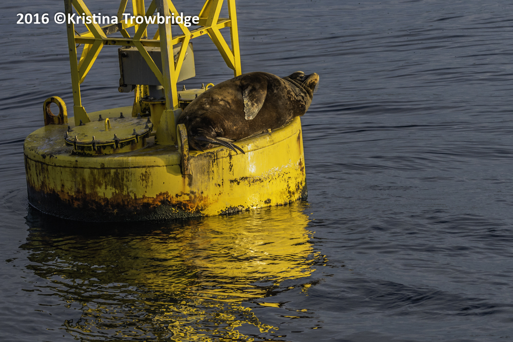 California Sea lion on a marker at sunset