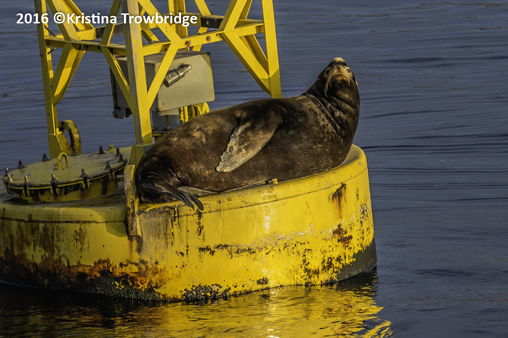 California Sea lion on a marker at sunset