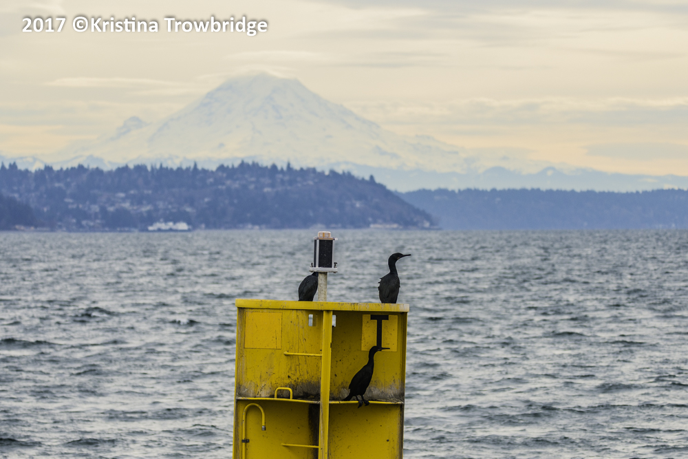 Three cormorants & Mt. Rainier in the hazy fog