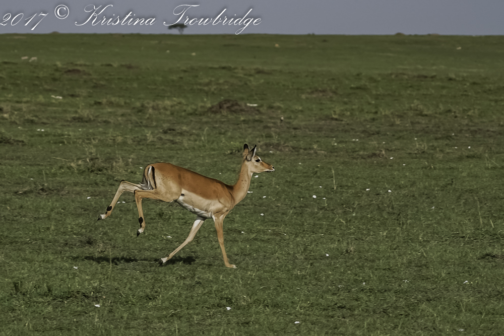 Impala running among toilet-paper flowers