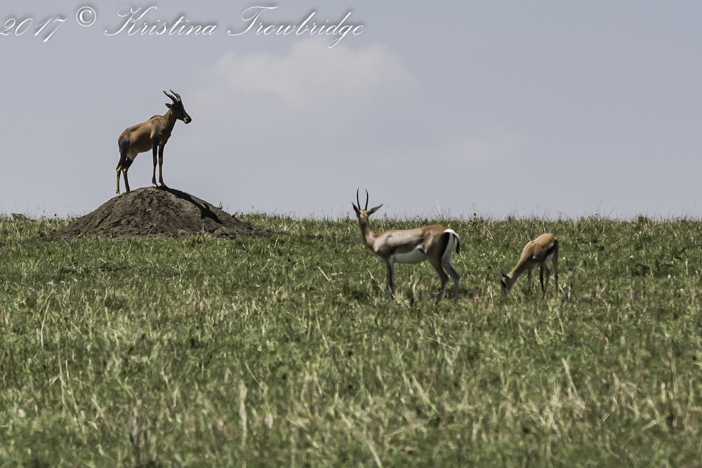 Topi on termite mound, Grant's gazelles