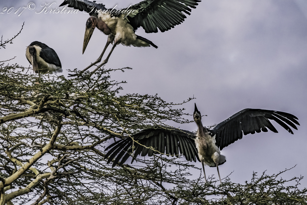 Marabou storks courting at sunset