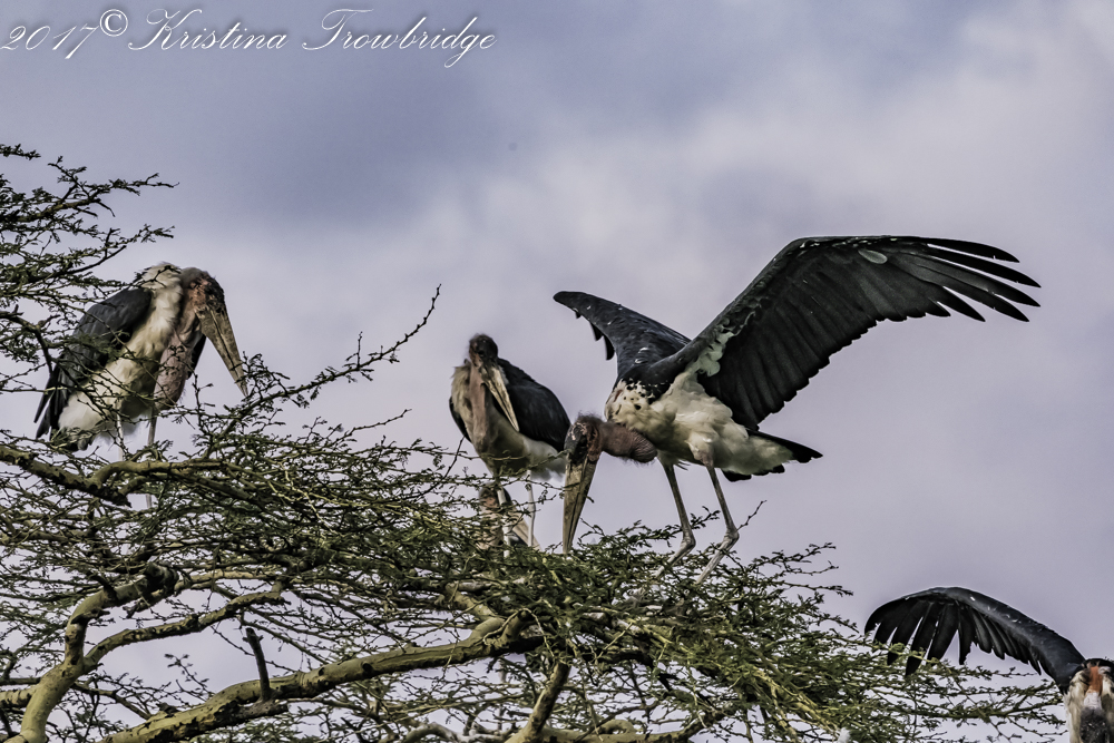 Marabou storks courting at sunset