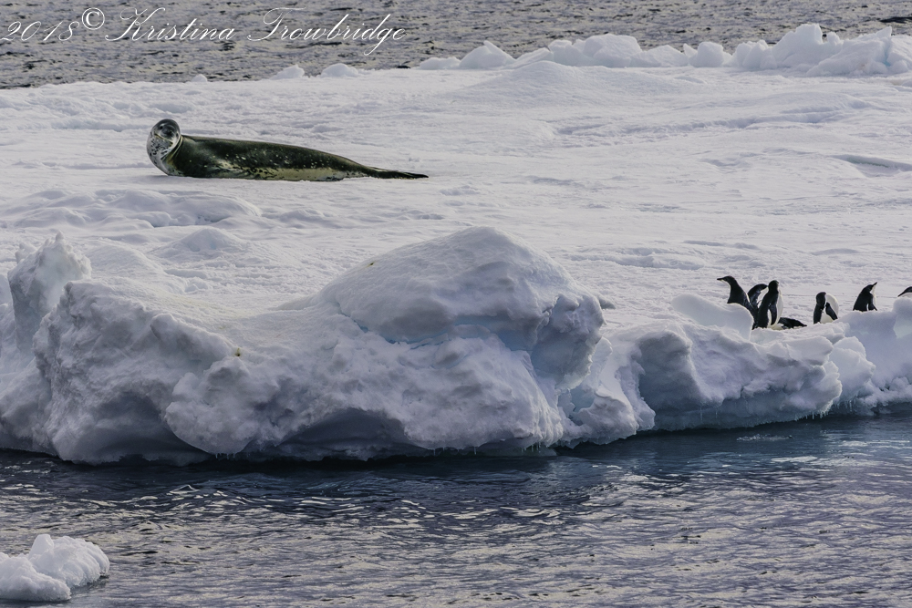 Leopard seal on the ice floe with penguins