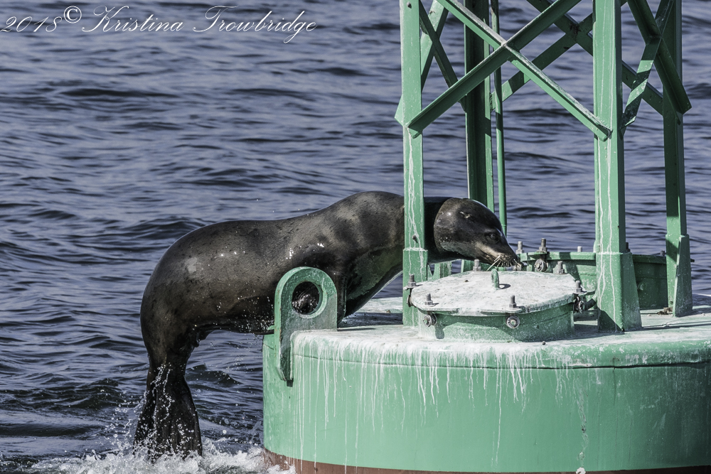 California sealion jumping onto a buoy