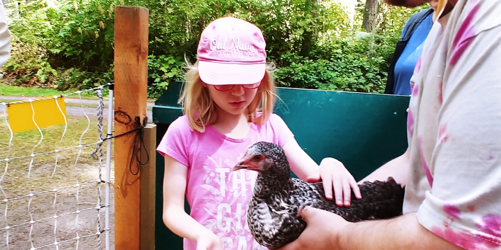 Petting Arica's chickens