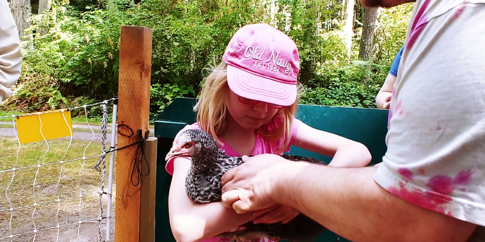 Petting Arica's chickens
