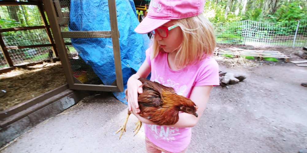 Petting Arica's chickens