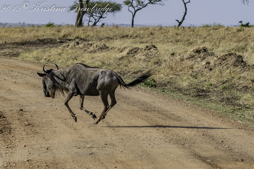 Wildebeest crossing the road