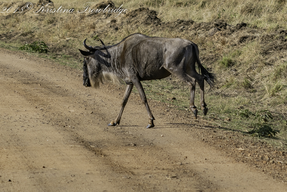 Wildebeest crossing the road