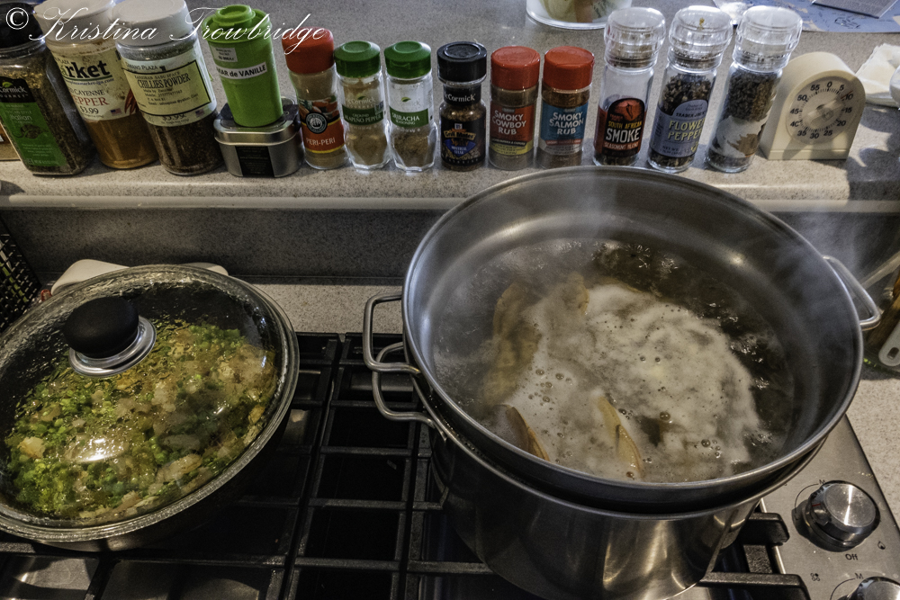 Into the boiling pot he goes, with peas, garlic and shallots