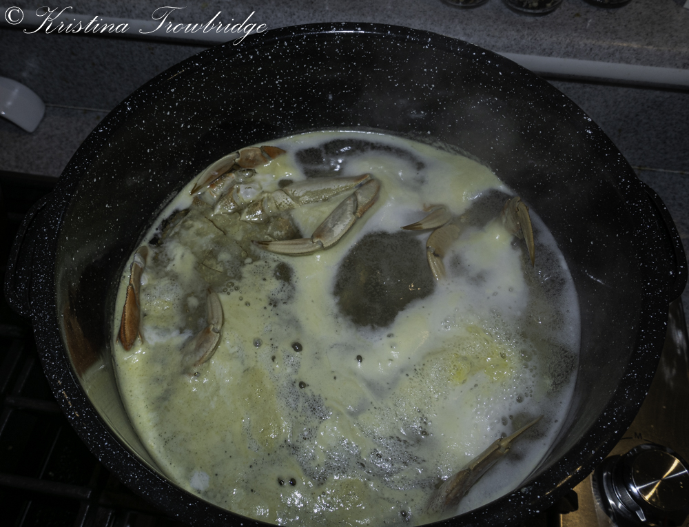 Two Dungeness crabs in the boiling pot