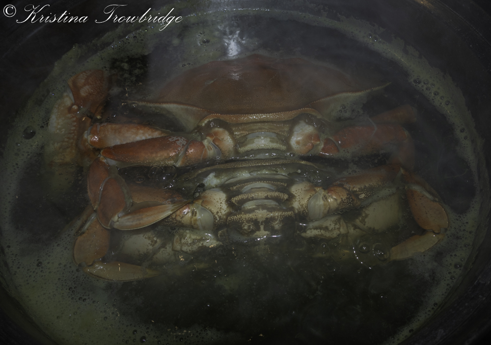 Two steaming Dungeness crabs in a boiling pot