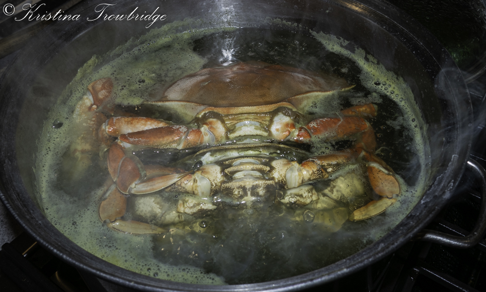 Two steaming Dungeness crabs in a boiling pot