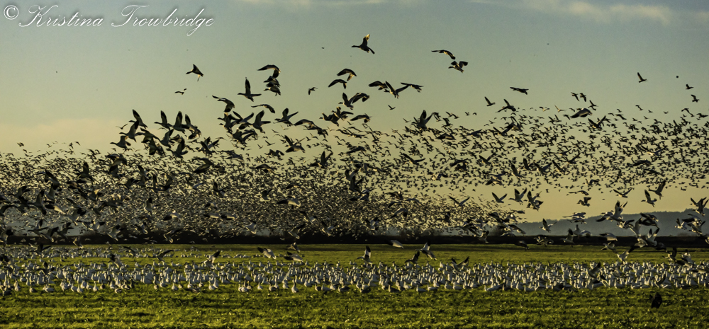 Snow Geese fly chased by a dog