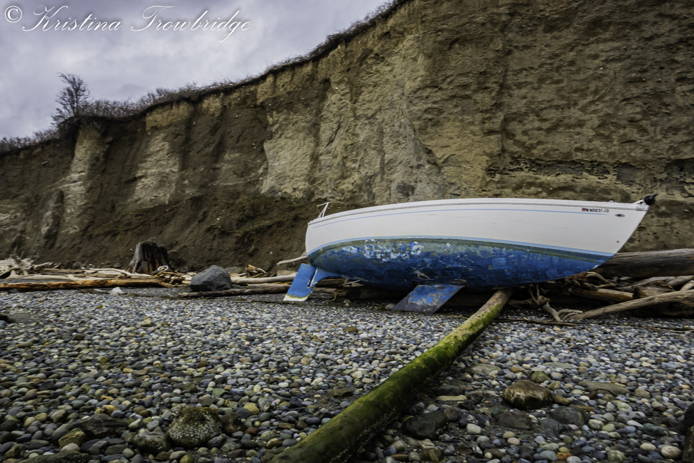 Washed up logs and beached sailboat